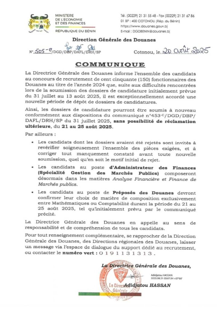 Une nouvelle période est accordée pour le dépôt de dossiers au concours de recrutement de 150 fonctionnaires des Douanes. Les candidats ont désormais jusqu’au 31 juillet 2025 pour soumettre leurs candidatures. L’annonce a été faite à travers un communiqué en date de ce mercredi 20 août 2025, signé par Adidjatou Hassan, Directrice Générale des Douanes. Ce nouveau délai accordé est dû aux difficultés rencontrées lors de la première période de soumission de candidatures.