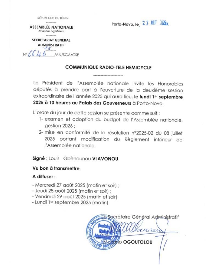 Les députés de la 9e législature se rendront à l’assemblée nationale le 1er Septembre prochain. En effet, la deuxième session de l’année en cours s’ouvre le 1er Septembre prochain. Louis, Vlavonou Président de l’Assemblée nationale l’a notifié à travers un communiqué en date du 27 Août 2025. Deux (02) points sont inscrits à l’ordre du jour de cette session. Il s’agit de : l’examen et adoption du budget de l’assemblée nationale, gestion 2026 et la mise en conformité de la résolution n° 2025-02 du 08 Juillet pourtant modification du règlement intérieur de l’assemblée nationale.