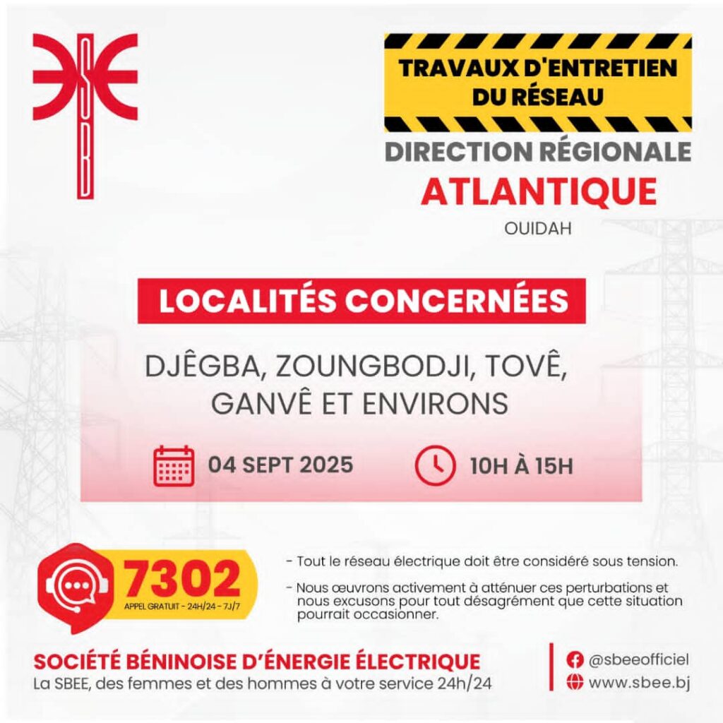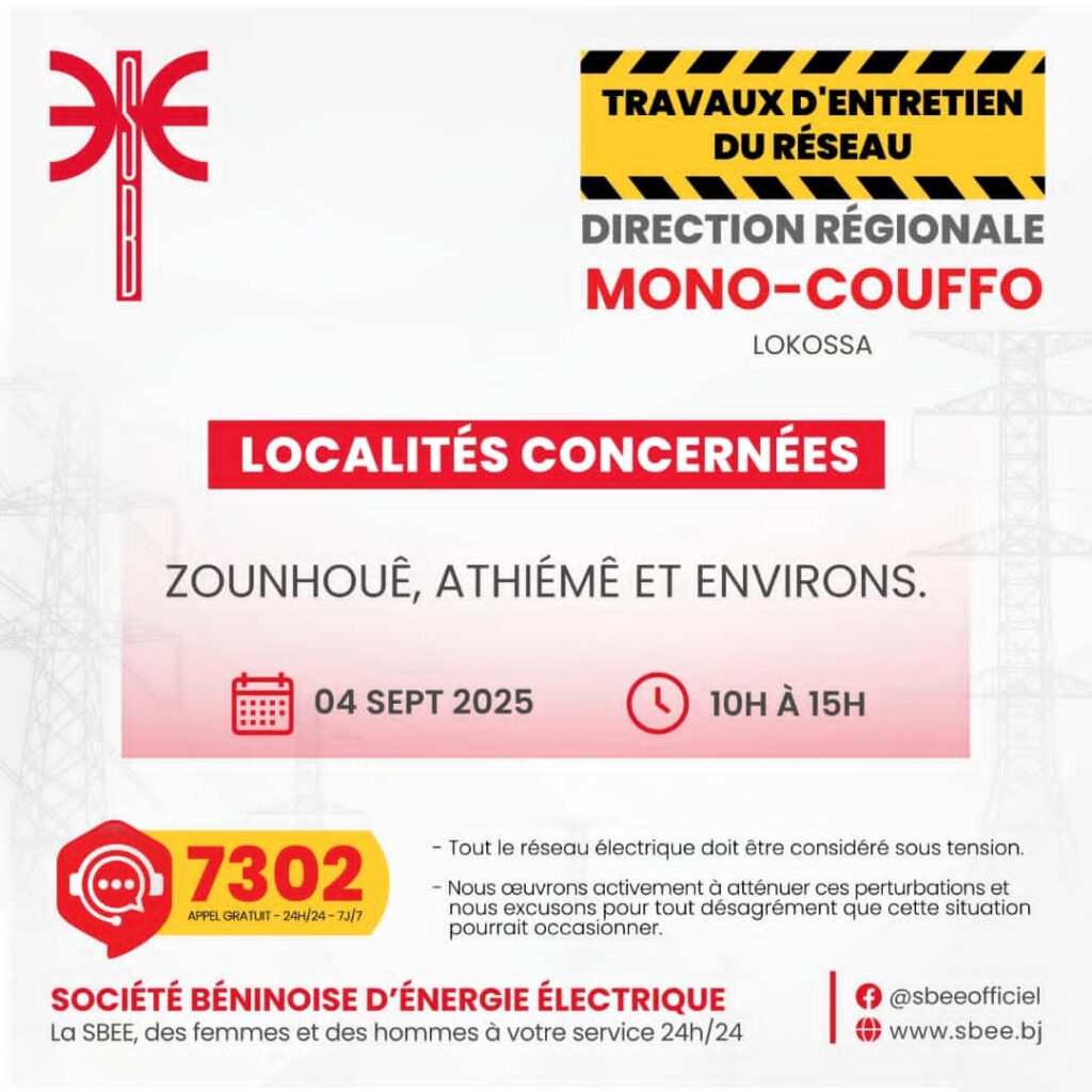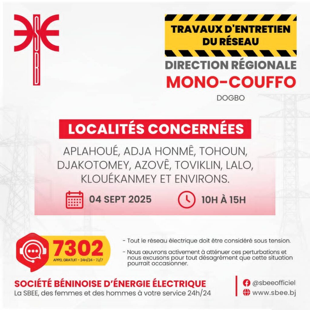 La Société Béninoise d’Énergie Électrique (SBEE) informe ses abonnés qu’elle va procéder à des travaux de maintenance. Il s’agit des travaux du réseau électrique qui vont se dérouler ce lundi 1er et jeudi 04 Septembre 2025. Ces interventions techniques visent à améliorer la qualité et la fiabilité de la distribution d’électricité à travers le pays. Plusieurs localités des départements de Atacora, Donga, Atlantique, littoral, Mono-couffo, Bourgou, Alibori, et des Collines pourront être perturbées durant les opérations.