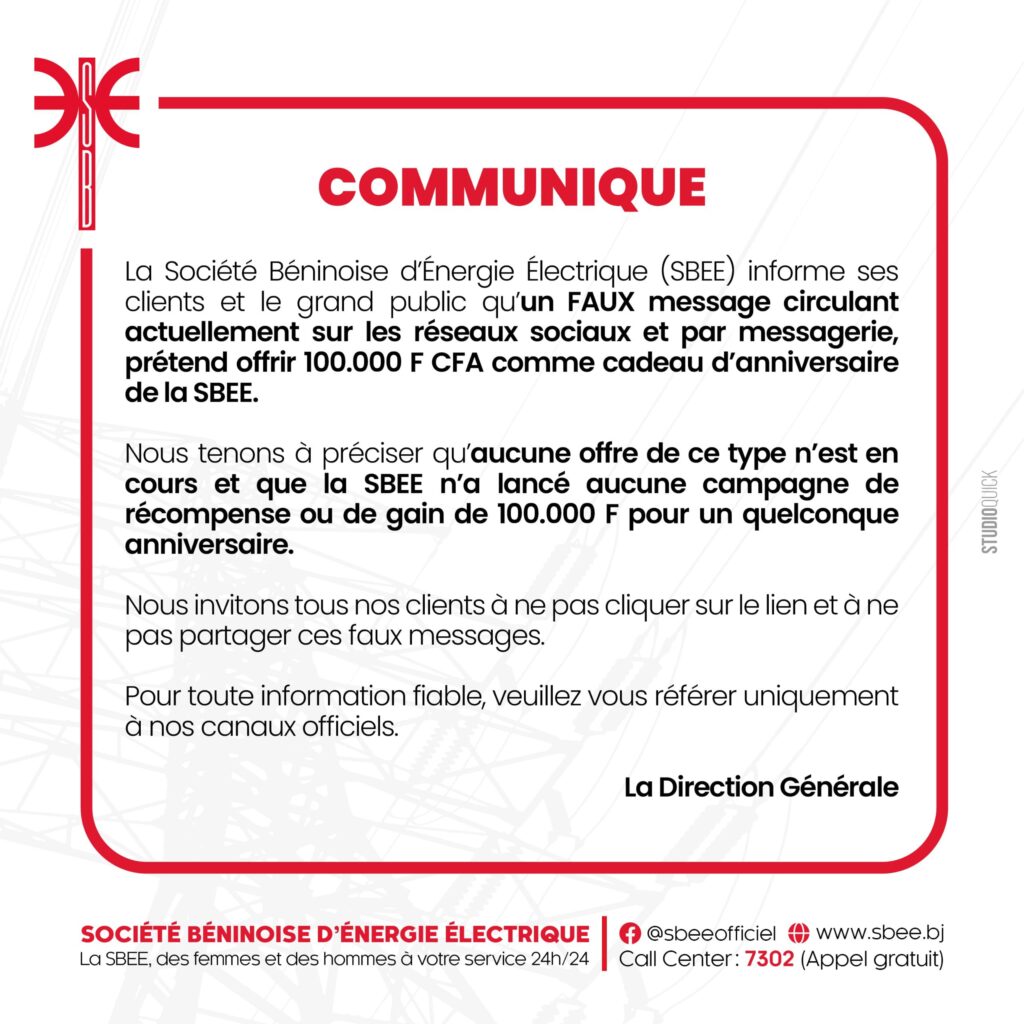 La Société Béninoise d’Énergie Électrique (SBEE) met en garde contre une escroquerie virale diffusée par messagerie. Un faux message fait croire aux clients qu’ils recevront 100 000 FCFA à l’occasion d’un prétendu anniversaire de l’entreprise.