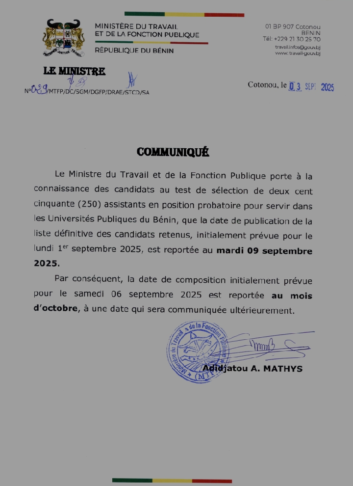 Le calendrier du test de sélection des 250 assistants destinés à intégrer les Universités Publiques du Bénin connaît un changement. La publication de la liste définitive des candidats retenus, initialement prévue pour le 1er septembre 2025, est désormais reportée au mardi 9 septembre 2025. L’annonce a été faite par Adidjatou Mathys, ministre du Travail et de la Fonction Publique ce mercredi 03 Septembre 2025.