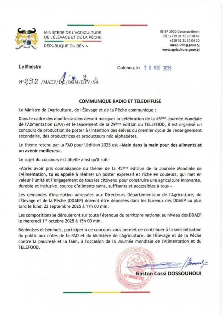 Le concours a été lancé à travers un communiqué officiel en date du 28 août 2025 et signé par le ministre Gaston Dossouhoui. Il vise à stimuler la créativité des jeunes et des producteurs en mettant en avant leur vision d’une agriculture durable et résiliente.