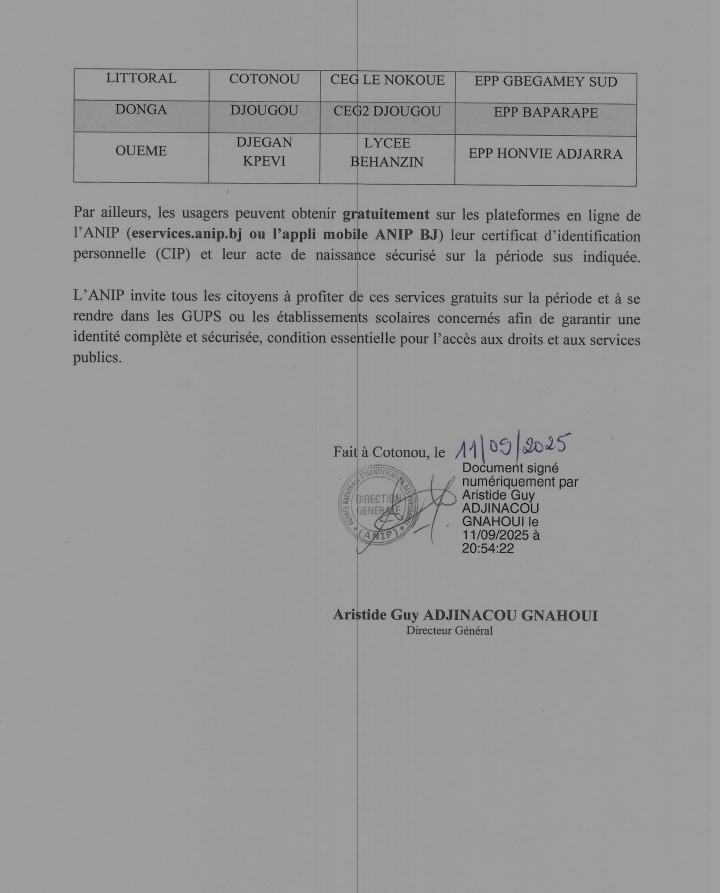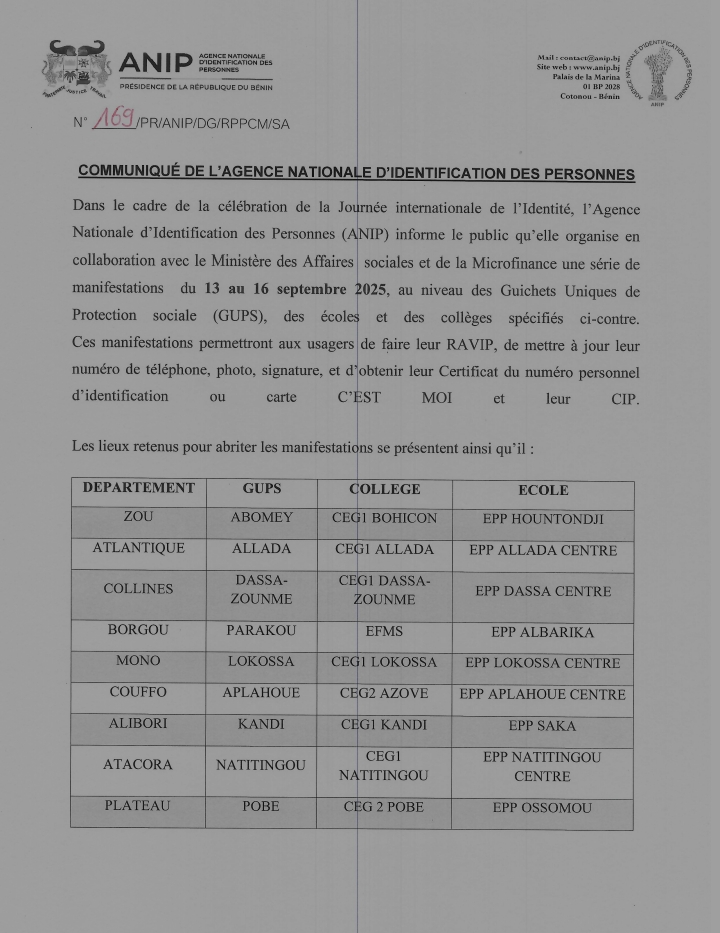 Dans la cadre de la célébration de la Journée Internationale de l’Identité, le Ministère des Affaires Sociales et de la Microfinance (MASM) et l’Agence Nationale d’Identification des Personnes (ANIP), organisent sur l’ensemble du territoire national, particulièrement au niveau des Guichets Uniques de Protection Sociale (GUPS), des écoles et des collèges, une série d’activité. Il s’agit de la mise à jour des données personnelles du RAVIP (photo, contact téléphonique, signature. Cette opération qui se déroulera du 13 au 16 septembre 2025 donnera également la possibilité aux populations d’obtenir gratuitement le CIP et l’acte de naissance sécurisé en ligne.