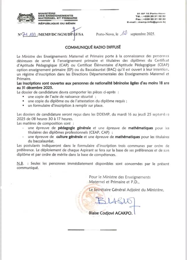 Ouvert aux citoyens béninois âgés d’au moins 18 ans au 31 décembre 2025, le processus se déroulera du mardi 16 au jeudi 25 septembre 2025, de 8h30 à 17h00, dans toutes les Directions Départementales des Enseignements Maternel et Primaire (DDEMP).