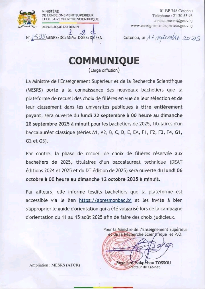 Les nouveaux admis au baccalauréat (séries A1, A2, B, C, D, E, EA, F1 à F4, G1 à G3) disposent de la période allant du lundi 22 septembre à 00h au dimanche 28 septembre 2025 à minuit pour soumettre leurs choix de filières. L’inscription et la sélection se font exclusivement en ligne, via la plateforme officielle https://apresmonbac.bj. L’information a été dévoilée à travers un communiqué en date de ce mercredi 17 septembre 2025.