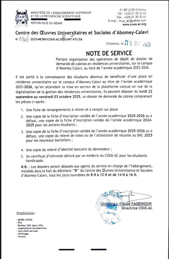 Les inscriptions pour l’attribution des cabines universitaires seront ouvertes du lundi 22 septembre au vendredi 3 octobre 2025. L’information a été dévoilée à travers une note de service du Centre des Œuvres Universitaires et Sociales d’Abomey-Calavi (COUS-AC) en date du 16 septembre. Cette opération concerne les étudiants désireux d’obtenir un hébergement sur le campus d’Abomey-Calavi. Selon le communiqué, les dossiers devront être déposés dans les délais fixés, faute de quoi les demandes ne seront pas prises en compte.