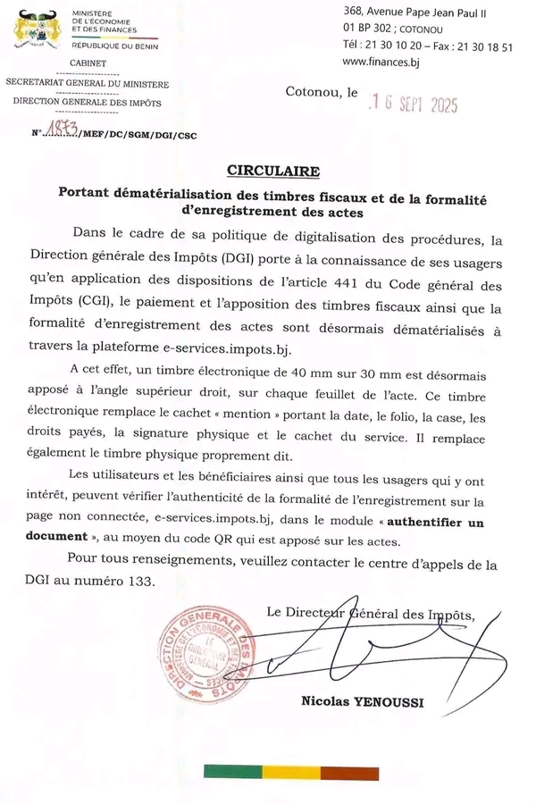 Dans une circulaire officielle, le Directeur général des Impôts, Nicolas Yénoussi, a confirmé la dématérialisation totale des timbres fiscaux et de l’enregistrement des actes, conformément à l’article 441 du Code général des impôts. « L’ancienne pratique consistant à apposer un timbre physique ou une mention manuelle disparaît au profit du timbre électronique », a-t-il précisé.
