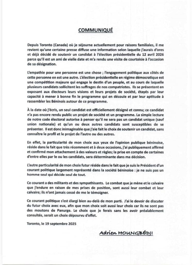 Depuis Toronto où il séjourne, Adrien Houngbédji a réagi aux rumeurs relayées dans certains médias faisant état d’un prétendu soutien de sa part à un candidat déjà en lice pour la présidentielle du 12 avril 2026. Dans un communiqué daté du 19 septembre 2025, l’ancien président de l’Assemblée nationale a tenu à clarifier sa position politique.