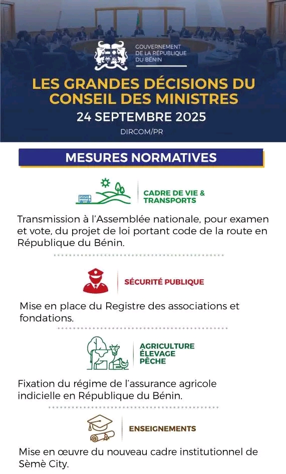 Le traditionnel conseil des ministres s’est réuni sous la Présidence du Chef de l’État Patrice Talon ce mercredi 24 septembre 2025. Lors de cette séance hebdomadaire, plusieurs décisions ont été prises.