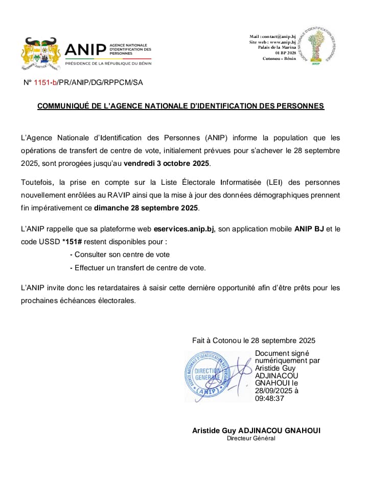 L’Agence Nationale d’Identification des Personnes (ANIP) annonce la prolongation du délai pour les opérations de transfert de centre de vote. Initialement fixée au 28 septembre, l’échéance est repoussée au vendredi 3 octobre 2025. Un prolongement qui offre aux électeurs béninois une ultime chance de régulariser leur situation avant les élections. L’information a été annoncée àtravers un communiqué du Directeur Général Aristide Guy Adjinacou Gnahoui, en date de ce Dimanche 28 septembre 2025.