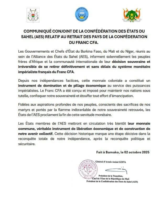 Adopté ce 2 octobre 2025 à Bamako, le communiqué souligne que cette orientation répond aux aspirations des peuples du Sahel et aux sacrifices consentis dans leur histoire récente. L’AES inscrit ainsi son action dans une logique de rupture assumée avec l’ancien ordre monétaire régional.