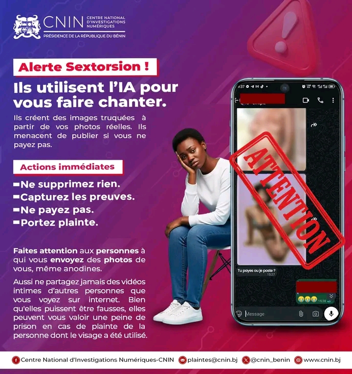 Le centre invite par ailleurs les victimes à ne pas céder aux menaces ou au chantage et à porter plainte en adressant un mail à : plaintes@cnin.bj