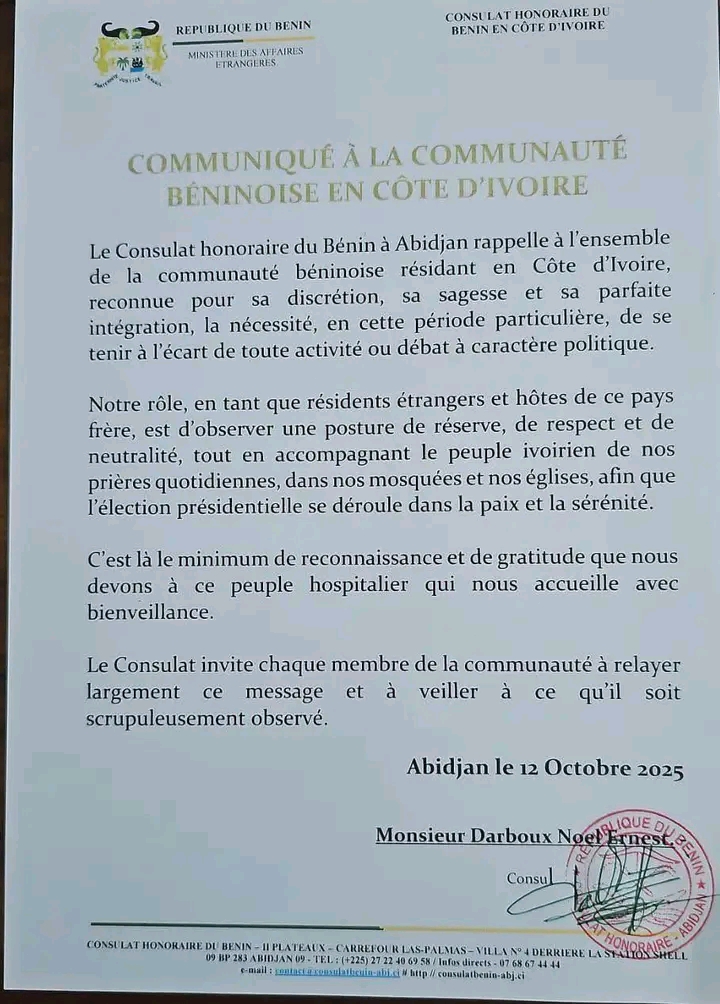 À l’approche de l’élection présidentielle en Côte d’Ivoire, le Consulat honoraire du Bénin à Abidjan exhorte la communauté béninoise à observer une stricte neutralité politique et à s’abstenir de toute participation aux débats ou activités à caractère partisan. Dans un communiqué officiel en date de ce Dimanche 12 octobre 2025, le consul honoraire, Darboux Noël Ernest, a rappelé que les ressortissants béninois doivent « se tenir à l’écart de toute polémique politique », soulignant l’importance d’une posture de réserve, de respect et de discrétion, conformément aux valeurs qui caractérisent traditionnellement la communauté béninoise en Côte d’Ivoire. Le Consulat insiste sur la nécessité, pour les Béninois vivant en Côte d’Ivoire, de témoigner leur reconnaissance au peuple ivoirien pour son hospitalité et sa bienveillance. « C’est un devoir de gratitude envers ce pays frère qui nous accueille », précise le communiqué.