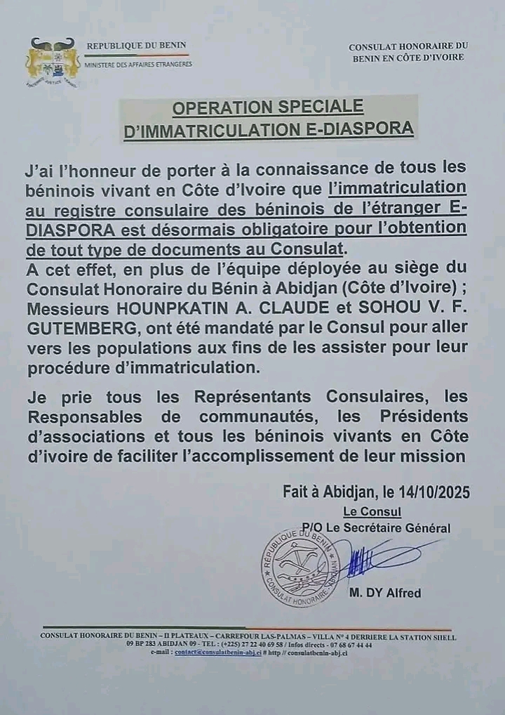 Le Consulat honoraire du Bénin en Côte d’Ivoire annonce le lancement d’une opération spéciale d’immatriculation e-Diaspora, désormais obligatoire pour tous les Béninois résidant sur le territoire ivoirien. Cette démarche est une condition préalable pour l’obtention de tout document consulaire, selon une note officielle signée par le Secrétaire général du consulat M. DY Alfred représentant le Consul. Pour faciliter la procédure, le Consul a mandaté Messieurs Hounpkatin A. Claude et Sohou V. F. Gutemberg afin d’aller à la rencontre des communautés béninoises à travers le pays. Leur mission esr d’accompagner les ressortissants dans l’enregistrement au registre consulaire e-Diaspora. Il s’agit d’une plateforme numérique mise en place par le gouvernement béninois pour mieux suivre et soutenir sa diaspora.
