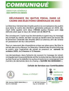 La DGI invite les retardataires à effectuer les démarches nécessaires dans les délais impartis afin d’éviter tout blocage administratif. Elle souligne par ailleurs que les services fiscaux restent mobilisés à travers tout le territoire pour faciliter la délivrance rapide de ce document. Le quitus fiscal, rappelons-le, est un document indispensable pour toute candidature aux élections, attestant que le contribuable est en règle vis-à-vis du fisc.