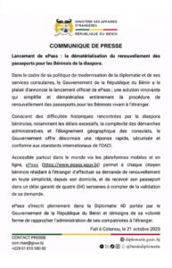 Le gouvernement béninois modernise totalement ses services consulaires avec le lancement officiel de ePass. Il s’agit d’une plateforme 100 % numérique dédiée au renouvellement en ligne des passeports pour les Béninois de la diaspora. Accessible depuis le site https://www.epass.gouv.bj ou via les applications mobiles, ePass permet désormais aux citoyens béninois résidant à l’étranger d’effectuer leur demande de renouvellement sans se déplacer. Les démarches, autrefois longues et complexes, sont désormais centralisées en ligne, avec un délai de traitement garanti de quatre (04) semaines après validation du dossier.