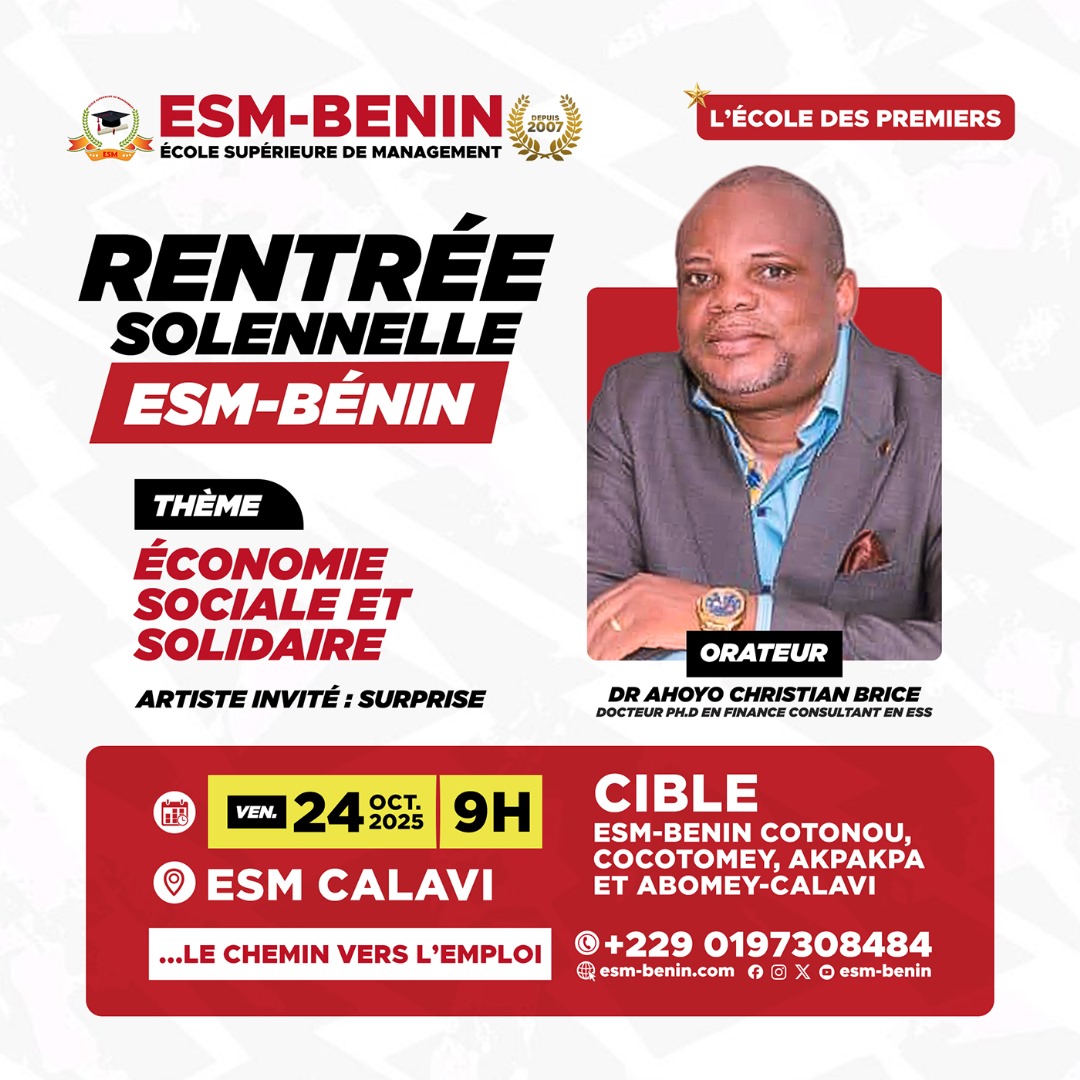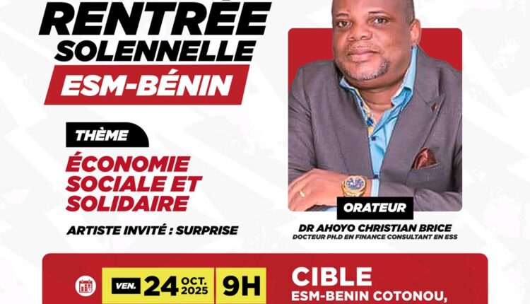 À l’Ecole Supérieure de Management (Esm-Bénin), les activités pédagogiques et celles liées au déroulement du calendrier universitaire vont prendre de l’envol ce vendredi 24 octobre 2025. La rentrée solennelle sera marquée par une communication inaugurale portant sur le thème : « Économie sociale et solidaire ». Pour explorer les pans de ce thème ô combien d’intérêt, un orateur expérimenté sera au-devant de la scène. Il s’agit de Brice Christian Ahoyo, docteur PhD en finance, consultant en économie sociale et solidaire (Ess). La cérémonie de lancement de la rentrée solennelle est prévue pour démarrer à 9h sur le site de l’Esm-Bénin de Calavi. L’ensemble des acteurs (étudiants, personnel, partenaires…) de l’Esm-Bénin sur l’ensemble du territoire national (Esm-Bénin Cotonou, Cocotomey, Akpakpa et Abomey-Calavi) seront tous au cœur de l’événement. Et assurément, le slogan  »Esm-Bénin, le chemin vers l’emploi » va retentir tout au long de cette rentrée solennelle ce vendredi 24 octobre.