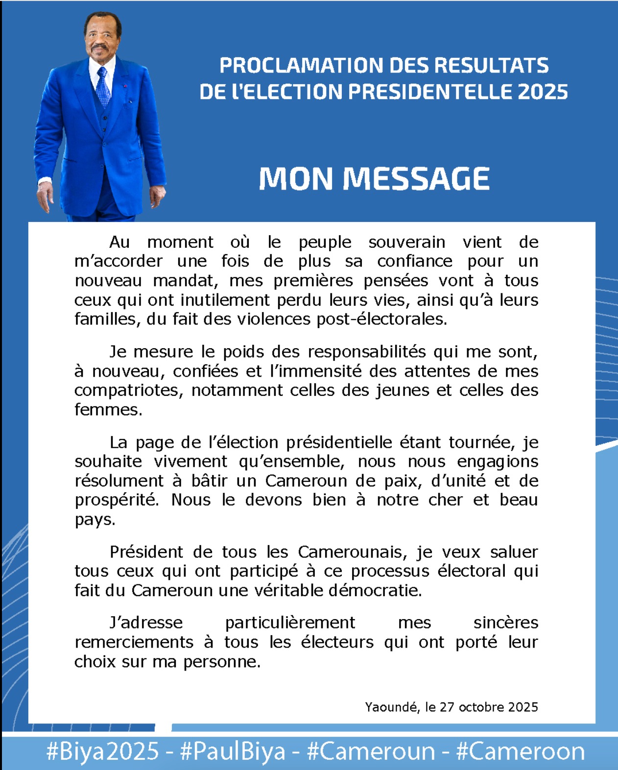 Dans son message publié peu après la proclamation des résultats, Paul Biya a tenu à rendre hommage aux victimes des violences post-électorales et à leurs familles. « Mes premières pensées vont à tous ceux qui ont inutilement perdu la vie, ainsi qu’à leurs proches », a déclaré le Président. Se présentant comme le Président de tous les Camerounais, Paul Biya a insisté sur la nécessité de tourner la page des tensions politiques et de s’engager collectivement vers la paix, l’unité et la prospérité. « La page de l’élection présidentielle étant tournée, je souhaite vivement qu’ensemble, nous bâtissions un Cameroun de paix, d’unité et de prospérité. »