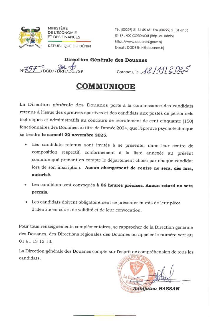 La Direction générale des Douanes (DGD) a annoncé ce mercredi 12 novembre 2025, la tenue de l’épreuve psychotechnique dans le cadre du concours de recrutement de 150 fonctionnaires des Douanes au titre de l’année 2024. Selon un communiqué signé par la Directrice générale, Adidjatou HASSAN, cette phase décisive est programmée pour le samedi 22 novembre 2025.