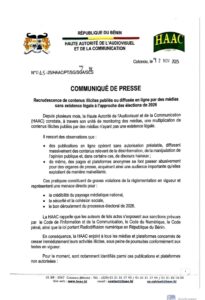 À l’approche des élections générales de 2026, la Haute Autorité de l’Audiovisuel et de la Communication (HAAC) constate une hausse préoccupante de publications illicites sur les plateformes numériques. La 7ᵉ mandature, déterminée à préserver la paix et la cohésion sociale, relève que plusieurs médias sans existence légale au Bénin diffusent des contenus de désinformation, des messages haineux ou des publications portant atteinte à l’ordre public.