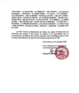 Selon l’unité de monitoring de l’institution, 36 pages et plateformes alimentent actuellement ces dérives. Face à cette situation, la HAAC a publié, le 12 novembre 2025, le communiqué n°015-25/HAAC mettant en demeure les responsables concernés. Elle leur ordonne de mettre fin immédiatement à leurs activités illicites, faute de quoi des poursuites seront engagées conformément aux textes en vigueur. La liste complète des plateformes visées a été rendue publique pour informer les citoyens et rappeler l’importance du respect du cadre légal en période préélectorale.