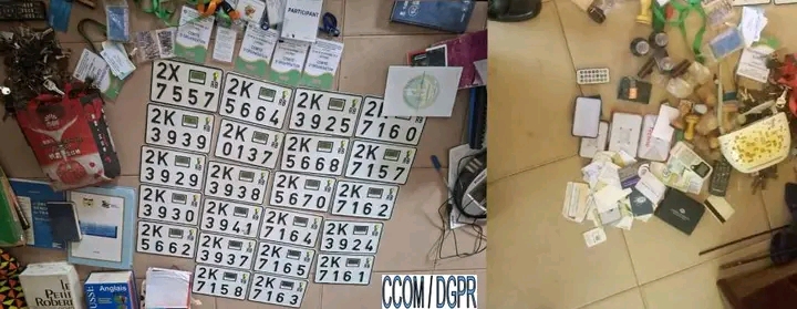 La perquisition effectuée au domicile des deux suspects a permis de mettre la main sur un matériel conséquent, susceptible d’être utilisé dans des activités de falsification ou de trafic de documents. Parmi les objets saisis figurent : un ordinateur portable de marque HP, vingt-deux (22) plaques d’immatriculation, trente (30) cartes grises,plusieurs clés de motocyclettes, dix-neuf (19) cachets et quatre (04) encreurs, des badges d’accès, des cartes de visite,un routeur, ainsi que divers documents et autres pièces à conviction.