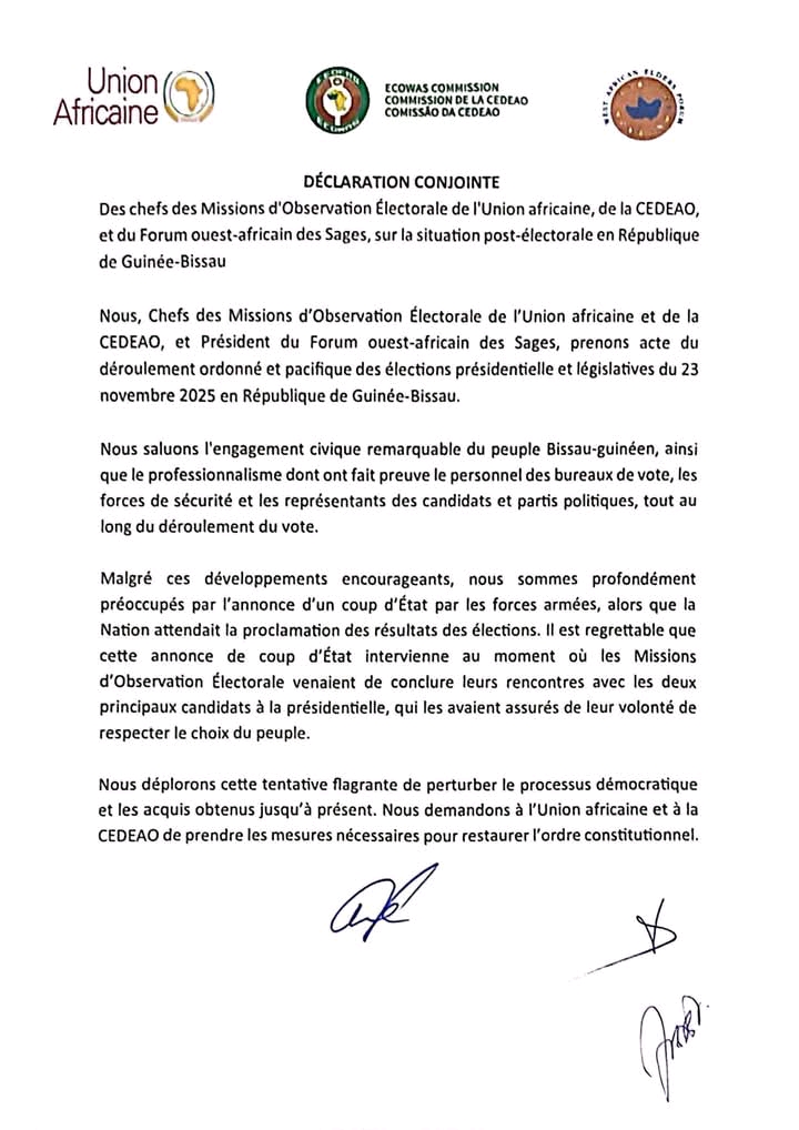 La CEDEAO et l’Union africaine ont condamné avec fermeté le coup d’État en Guinée-Bissau. Ils exigent la libération immédiate des responsables arrêtés par l’armée. Selon la déclaration conjointe, le putsch intervient au moment où les Missions d’Observation Électorale venaient d’achever des consultations avec les deux principaux candidats, qui avaient réaffirmé leur engagement à respecter le verdict des urnes.