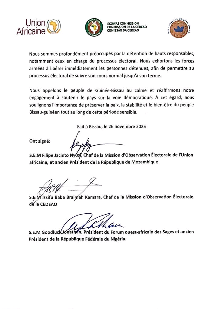 Parmi les personnes détenues figurent des hauts responsables impliqués dans la gestion du scrutin. La CEDEAO et l’Union africaine demandent leur libération sans délai afin de permettre au processus électoral de se poursuivre normalement jusqu’à son terme.