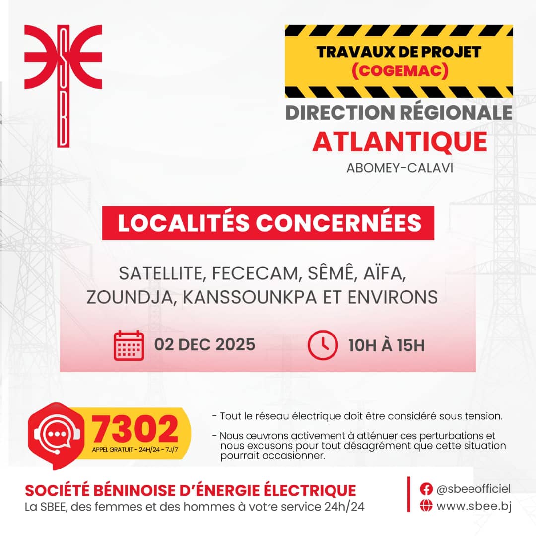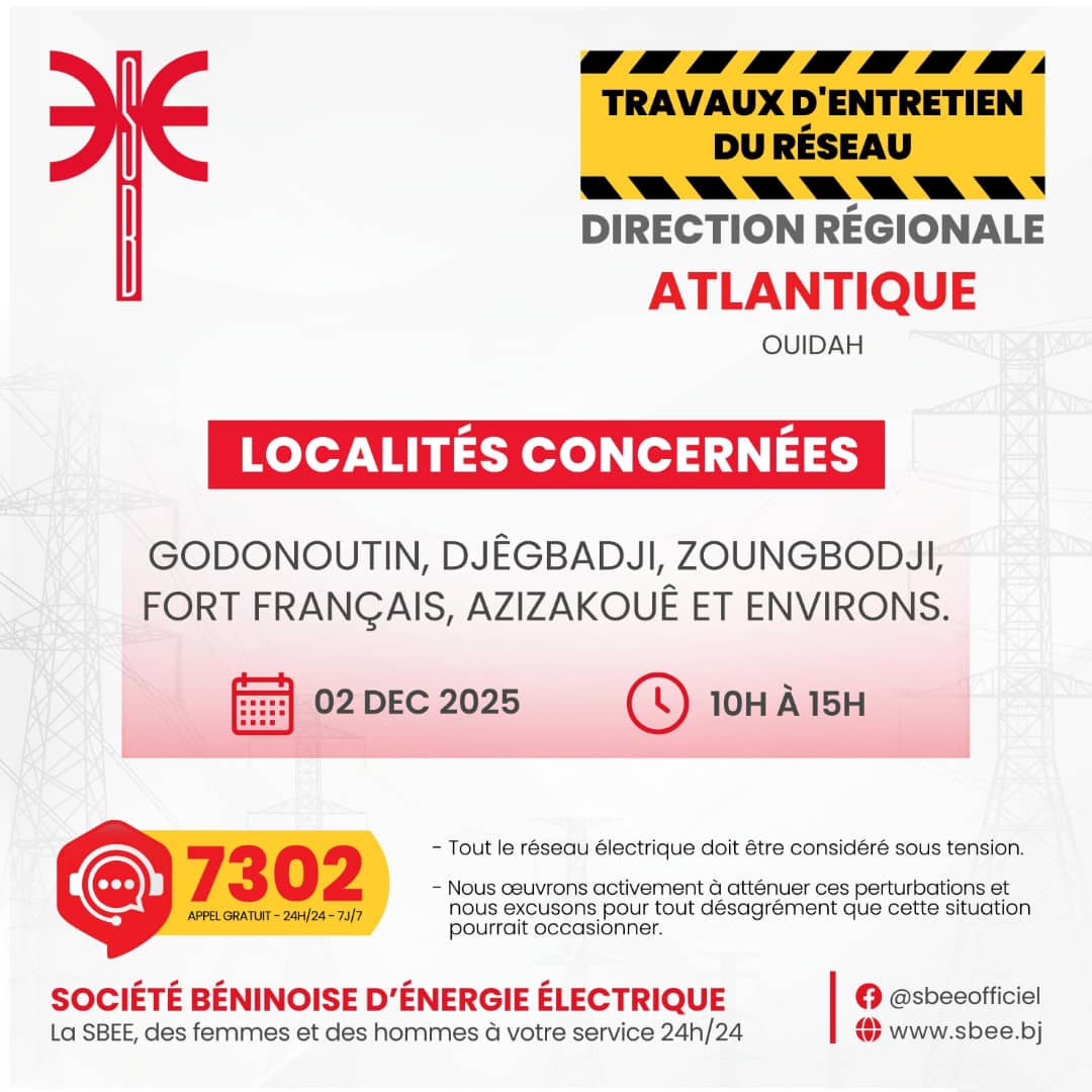 La Société Béninoise d’Énergie Électrique (SBEE) va procéder à d’importants travaux de maintenance du réseau électrique ce Mardi 02 Décembre 2025, entre 10h et 15h. Ces interventions qui seront menées sur plusieurs lignes de distribution, entraîneront des coupures temporaires d’électricité dans dix départements. Selon un communiqué officiel, les localités concernées sont réparties dans les départements du Atlantique, Donga, Mono-couffo, Bourgou, Collines, Atacora, Alibori.