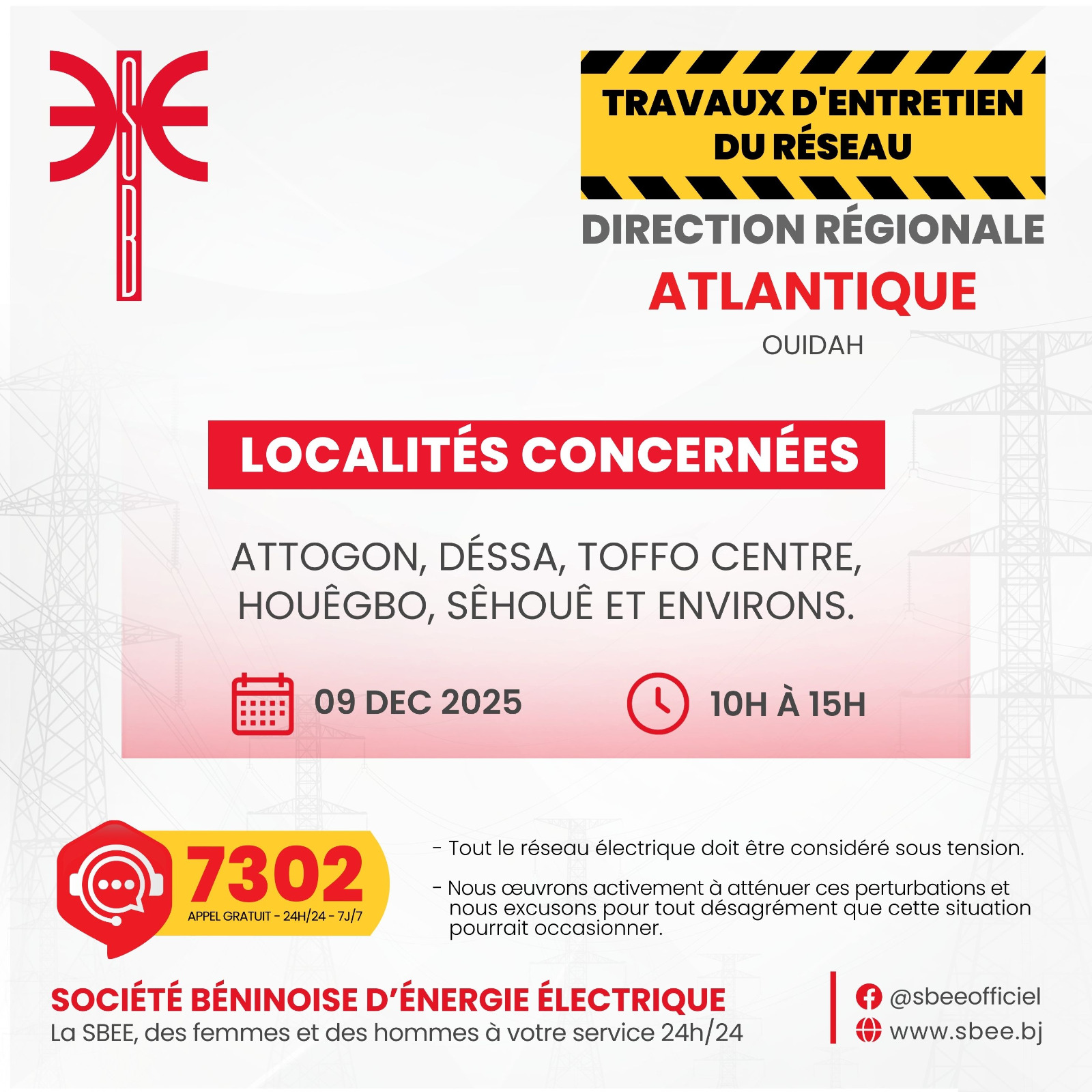 La Société Béninoise d’Énergie Électrique (SBEE) va procéder à d’importants travaux de maintenance du réseau électrique ce Mardi 09 Décembre 2025 entre 9h et 15h.