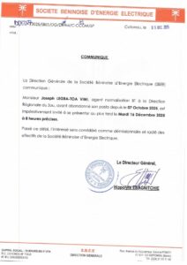 La SBEE publie un nouvel avis d’abandon de poste qui vise un agent de la direction régionale du Zou. Selon le communiqué, Joseph Legba-Toa Vimi, chargé de la normalisation BT, a quitté son poste depuis le 7 octobre 2025 sans donner suite. La direction générale le convoque pour une ultime comparution.