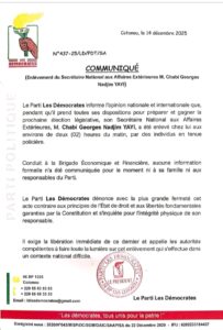 L’interpellation de Chabi Yayi, survenue au petit matin de ce dimanche 15 décembre 2025, a provoqué une réaction immédiate de son parti, Les Démocrates. Dans un communiqué officiel, la formation politique dénonce une arrestation jugée abusive et réclame la remise en liberté de son secrétaire national aux Affaires étrangères. Sur le papier, le ton est ferme. À la lecture attentive, le malaise saute aux yeux.