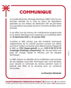 La Société Béninoise d’Énergie Électrique (SBEE) informe sa clientèle que tous les travaux de maintenance programmée sur le réseau seront suspendus du 15 décembre 2025 au 15 janvier 2026. Cette mesure vise à assurer une alimentation électrique continue pendant les fêtes de fin d’année. Toutefois, la SBEE précise que des pannes imprévues peuvent survenir et invite les clients à contacter rapidement son Centre d’appel au 7302 (appel gratuit) ou au +229 01 68 52 52 53 (WhatsApp) pour une intervention rapide. La société assure que ses équipes techniques et commerciales resteront mobilisées pour garantir le service et remercie ses clients pour leur confiance.