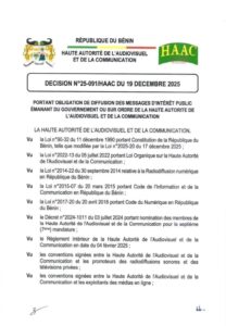 La Haac souligne que cette décision vise à protéger l’ordre public et à garantir la diffusion de l’information d’intérêt public. Elle s’appuie sur les articles 230 et 231 de la loi n°2015-07 du 20 mars 2015 portant code de l’information et de la communication en république du Bénin, ainsi que sur l’ensemble des textes réglementaires en vigueur.