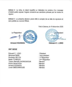 À travers la décision n°25-091 du 19 décembre 2025 l’autorité de régulation rend obligatoire la diffusion immédiate de tout message d’intérêt public émanant du gouvernement ou transmis par la Haac. Selon l’article 1er du texte, « tout organe de presse est tenu de publier ou de diffuser, sans délai et sans altération, tout message émanant du gouvernement ou sur ordre de la Haac, lorsque ce message est déclaré d’intérêt public ». L’article 4 précise que « le retard injustifié ou l’altération du contenu d’un message d’intérêt public expose l’organe de presse concerné aux sanctions prévues par les textes en vigueur ».
