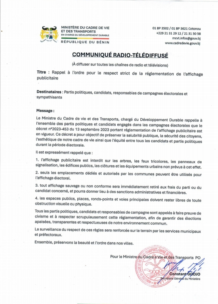 Le ministre du Cadre de vie et des Transports, chargé du Développement durable, a rappelé aux partis politiques et aux candidats engagés dans les campagnes électorales l’obligation de respecter la réglementation en vigueur en matière d’affichage publicitaire. À travers un communiqué officiel, il souligne que le décret n°2023-453 du 13 septembre 2023, encadrant l’affichage publicitaire demeure pleinement applicable durant toute la période électorale. Selon le ministre, cette décision vise à préserver la salubrité publique, à garantir la sécurité des citoyens, à protéger l’esthétique du cadre de vie.