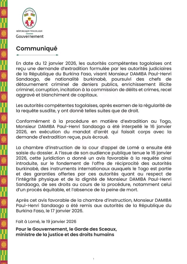 À l’issue de l’audience, la juridiction togolaise a rendu un avis favorable à l’extradition, s’appuyant sur plusieurs éléments de droit. À la suite de cet avis favorable, Paul-Henri Sandaogo Damiba a été remis aux autorités burkinabè le 17 janvier 2026.