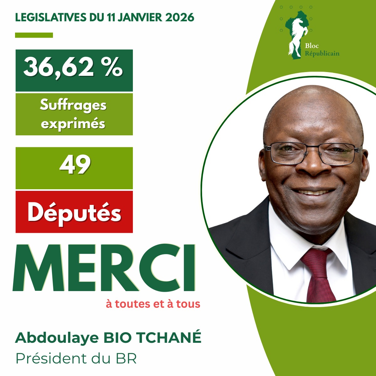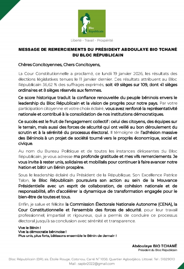 Le président du Bloc Républicain (BR), Abdoulaye Bio Tchané a exprimé sa gratitude aux Béninois après la proclamation des résultats des élections législatives du 11 janvier 2026 par la Cour constitutionnelle. Le parti de la mouvance présidentielle a recueilli 36,62 % des suffrages exprimés, décrochant 49 sièges sur les 109 que compte l’Assemblée nationale, dont 41 sièges ordinaires et 8 sièges réservés aux femmes.