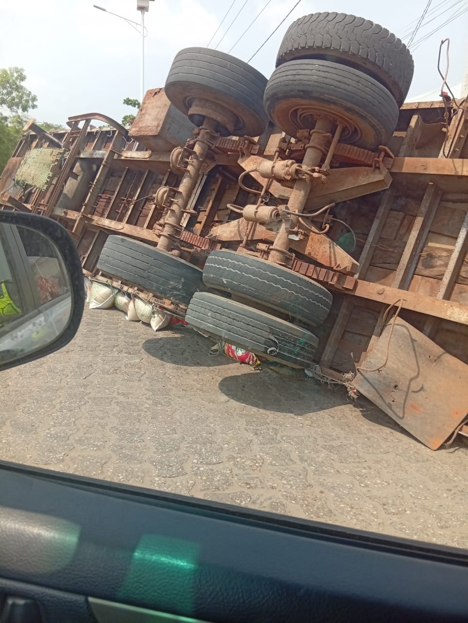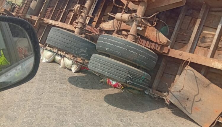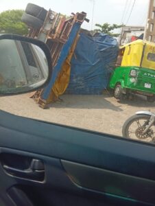 Le poids de la cargaison a entraîné la chute du véhicule sur un tricycle. Les sacs se sont répandus sur la chaussée, bloquant aussitôt la circulation dans ce point névralgique de la ville. Klaxons, arrêts brusques, regards inquiets, l’instant a été tendu.