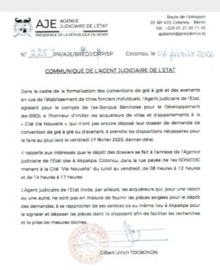L’Agent judiciaire de l’État, représentant l’ex-Banque Béninoise pour le Développement, invite les acquéreurs de villas et d’appartements de la Cité « Vie Nouvelle » qui n’ont pas encore déposé leur dossier de convention de gré à gré ou d’avenant à le faire au plus tard le 27 février 2026. Les dossiers doivent être déposés à l’annexe de l’Agence judiciaire de l’État à Akpakpa, Cotonou, aux heures ouvrables. Les acquéreurs ne disposant pas de toutes les pièces requises sont invités à se rapprocher des services concernés pour signaler leur situation et déposer les documents disponibles afin de faciliter le traitement de leur dossier.