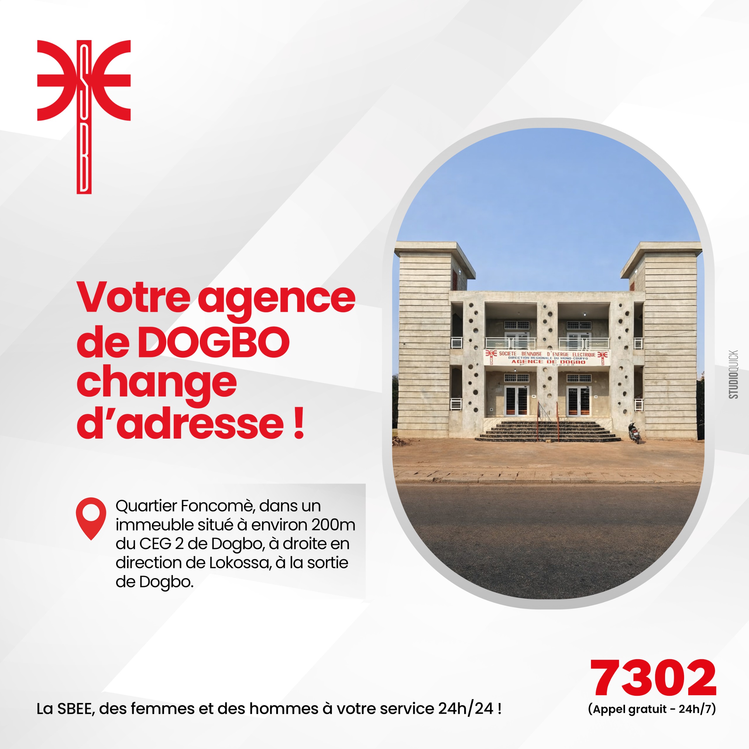Le nouveau site est désormais situé au quartier Foncomè, dans un immeuble implanté à environ 200 mètres du CEG 2 de Dogbo, à droite en direction de Lokossa, à la sortie de la ville. La SBEE rappelle que ses services restent accessibles 24h/24 via le 7302 (appel gratuit).