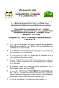 L’autorité de régulation estime que la diffusion de ces déclarations constitue une violation des dispositions constitutionnelles, du code de l’information et de la communication ainsi que du code de déontologie et d’éthique dans les médias au Bénin.La mesure relève également un « manque de professionnalisme dans la conduite de l’émission », l’animateur étant mis en cause pour avoir permis la diffusion des propos incriminés.