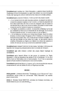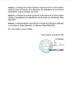 Au regard des faits relevés, le président de la HAAC a décidé de saisir le procureur de la république afin que les déclarations de l’invité fassent l’objet d’un examen judiciaire. La mesure précise qu’elle « prend effet à compter de la date de sa notification » aux parties concernées et qu’elle sera publiée au journal officiel.