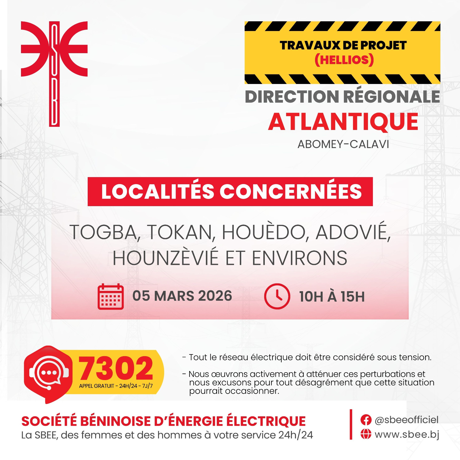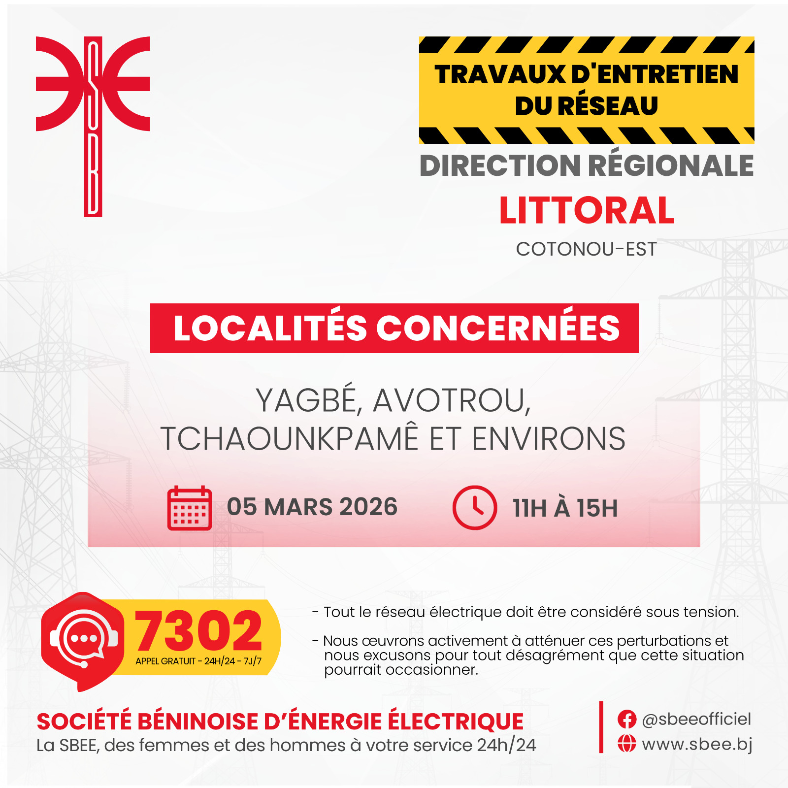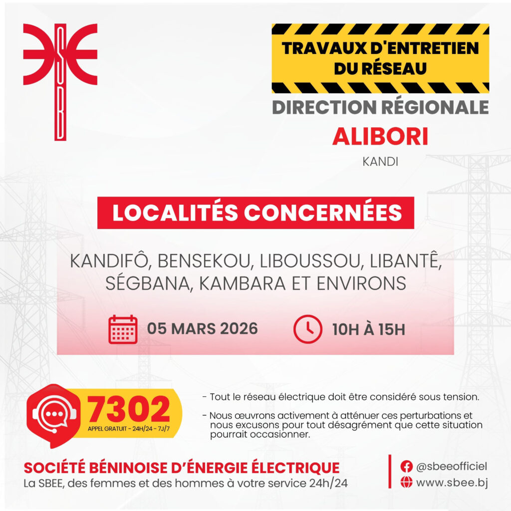 La Société Béninoise d’Énergie Électrique (SBEE) informe ses abonnés qu’une interruption temporaire d’électricité est prévue ce jeudi 05 mars 2026. Elle aura lieu de 10 heures à 15 heures, dans plusieurs localités du Bénin.
