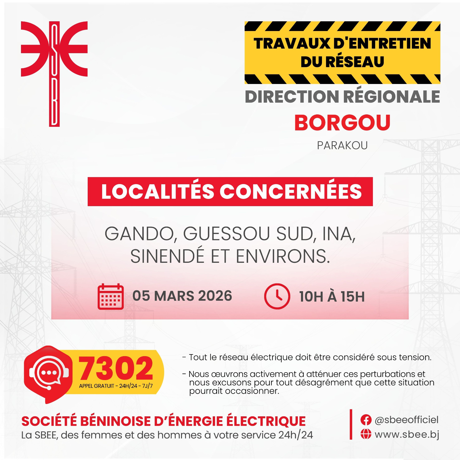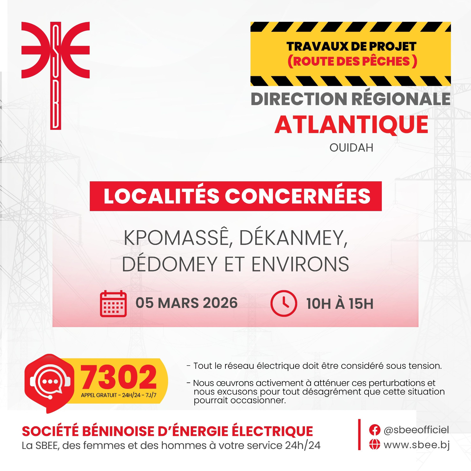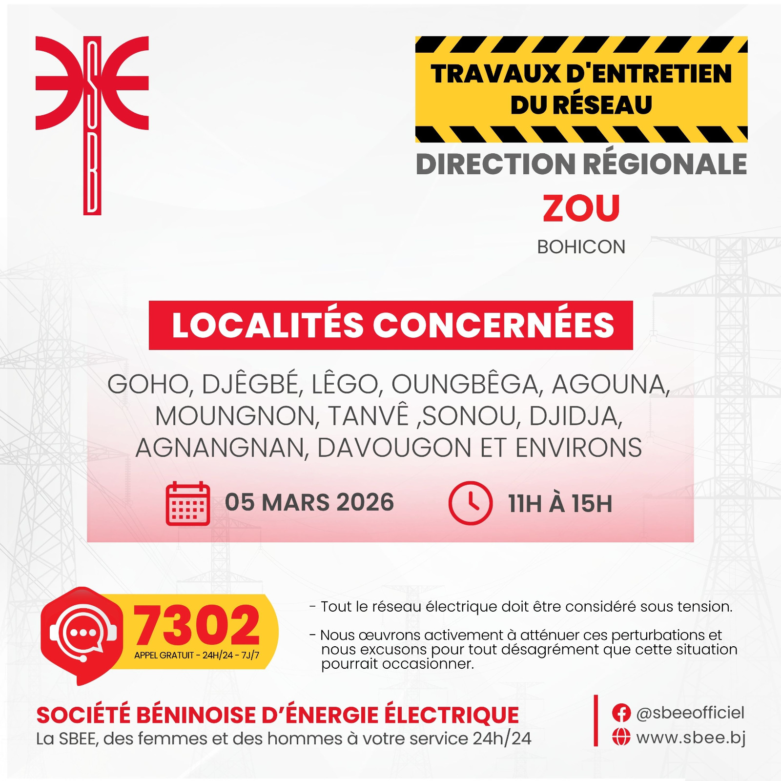 La Société Béninoise d’Énergie Électrique (SBEE) informe ses abonnés qu’une interruption temporaire d’électricité est prévue ce jeudi 05 mars 2026. Elle aura lieu de 10 heures à 15 heures, dans plusieurs localités du Bénin.