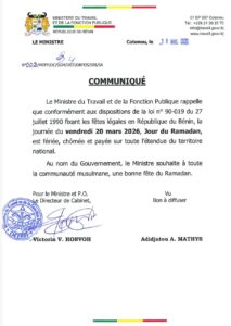 Le jour férié du Ramadan s’impose dans l’agenda national. Par communiqué officiel, le ministre du Travail et de la Fonction publique rappelle que le vendredi 20 mars 2026 est déclaré férié, chômé et payé sur toute l’étendue du territoire, conformément à la loi n° 90-019 du 27 juillet 1990.