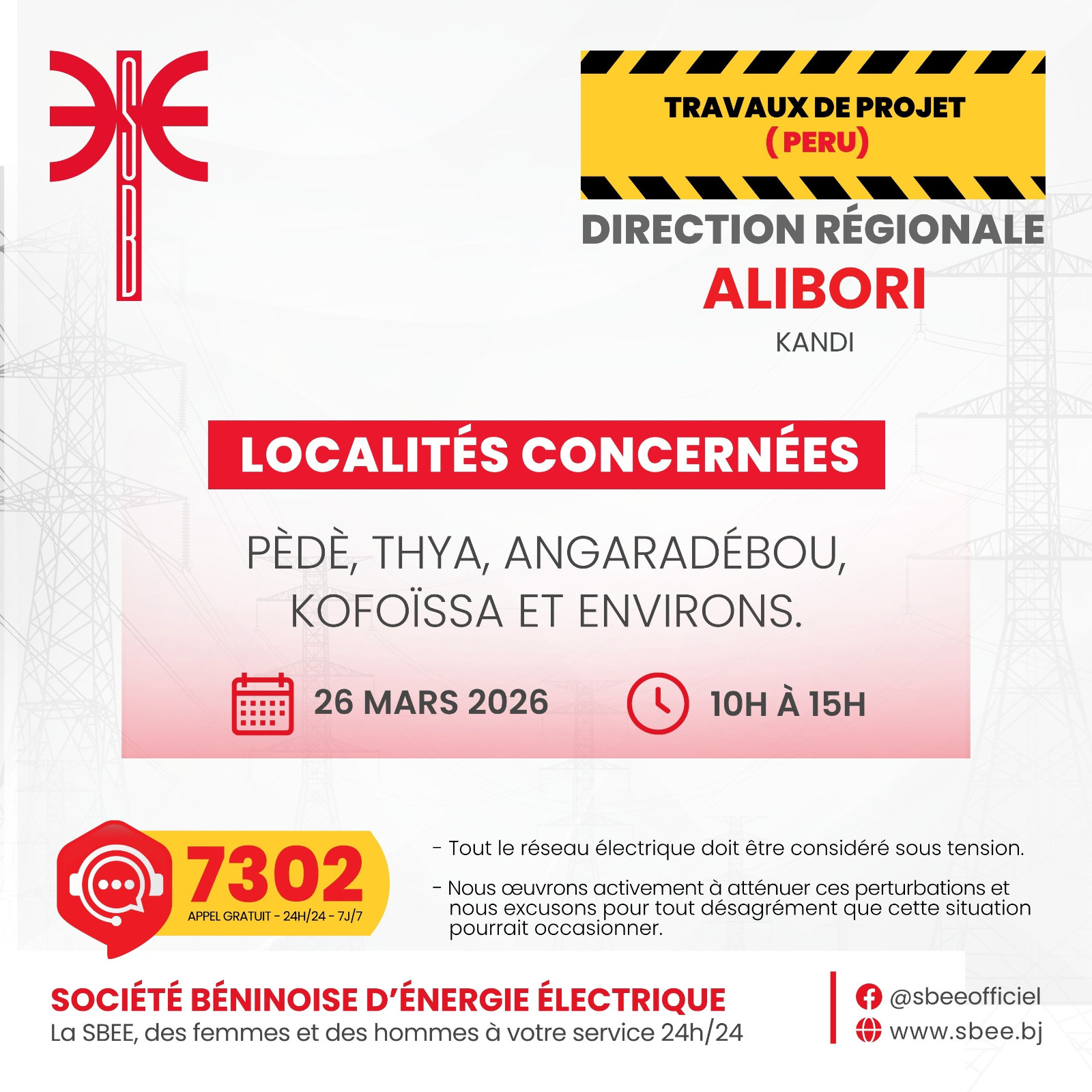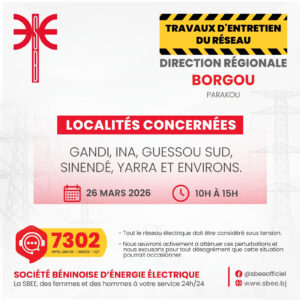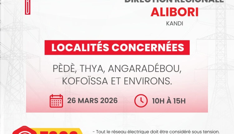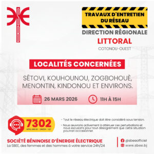 La Société Béninoise d’Énergie Électrique (SBEE) informe ses abonnés qu’une interruption temporaire de la fourniture d’électricité interviendra ce jeudi 26 mars 2026 dans plusieurs localités du pays. Les coupures sont programmées principalement entre 10 heures et 15 heures, selon les zones concernées.