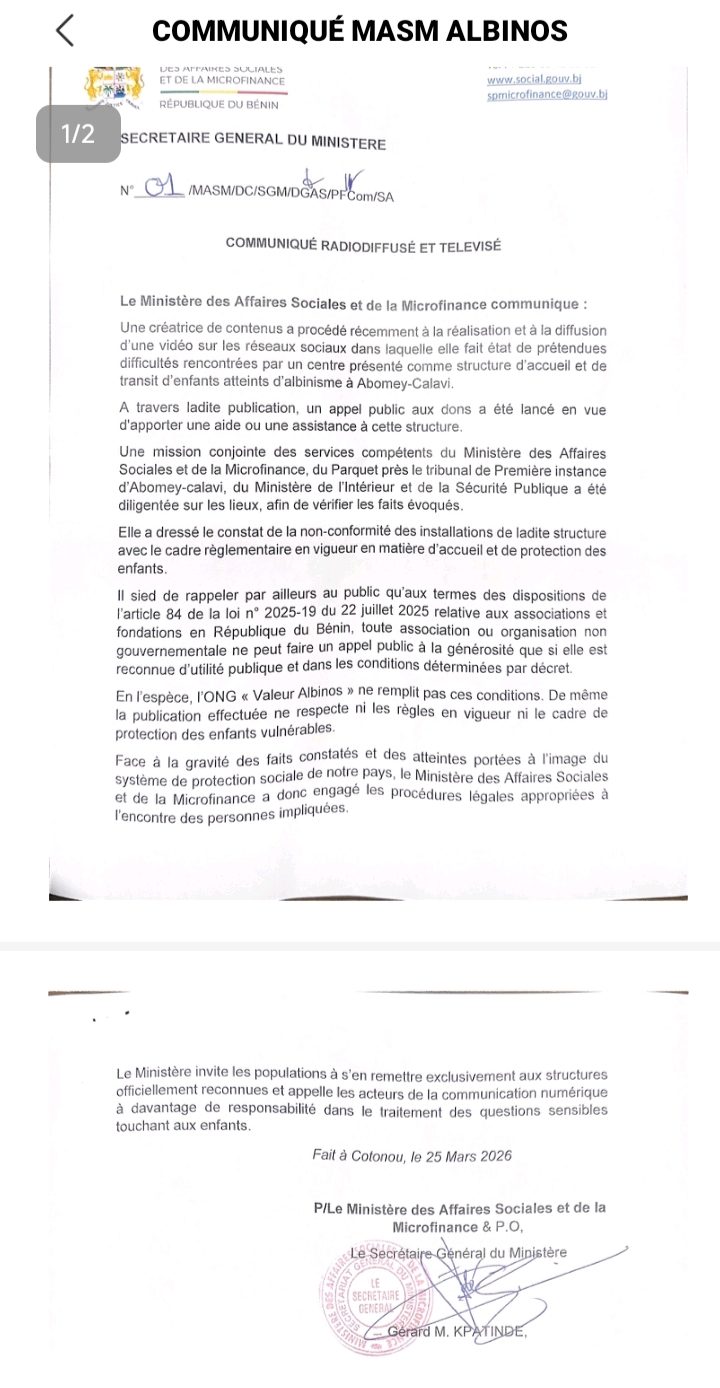 Le ministère des affaires sociales et de la Microfinance appelle les acteurs de la communication a traité avec responsabilité, les questions sensibles sur les enfants. À travers un communiqué en date du mercredi 25 Mars 2025, le ministère informe qu’une vidéo controversée impliquant un centre d’accueil d’enfants atteints d’albinisme à Abomey-Calavi a été diffusée récemment. Une enquête officielle a révélé de graves irrégularités dudit centre, entraînant l’ouverture de procédures judiciaires. Le gouvernement invite les populations à s’en remettre exclusivement aux structures reconnues.