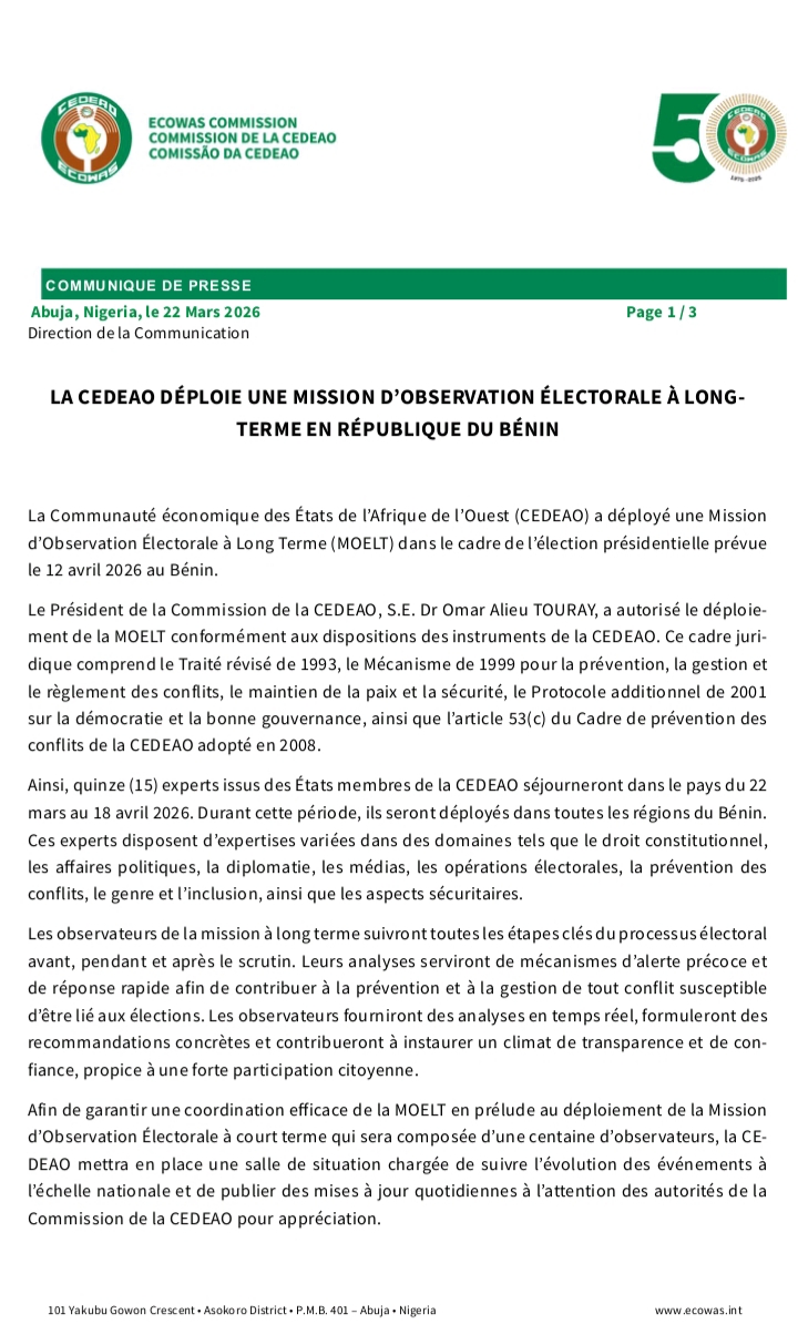 15 experts de la Communauté économique des États de l’Afrique de l’Ouest (CEDEAO) ont été déployés en Mission d’observation électorale à long terme (MOELT) au Bénin. L’information a été rapportée à travers un communiqué en date du 22 Mars 2026. Les personnes concernées vont séjourner du 22 mars au 18 avril 2026. Tout au long du déroulement de la présidentielle du 12 Avril, elles seront donc déployées dans les régions pour faire valoir leur expertise.