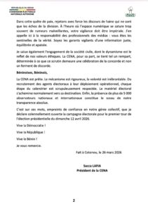 Dans son allocution, le président de la CENA a appelé les acteurs politiques à privilégier un climat apaisé. « Que cette campagne ne soit pas un duel de personnes, mais une confrontation féconde d’idées pour le développement durable de notre terre commune », a-t-il déclaré. Il a également insisté sur la responsabilité des médias dans la préservation d’un environnement électoral serein. « Vous êtes les sentinelles de la vérité. Soyez les garants vigilants d’une information juste, équilibrée et apaisée », a-t-il ajouté.